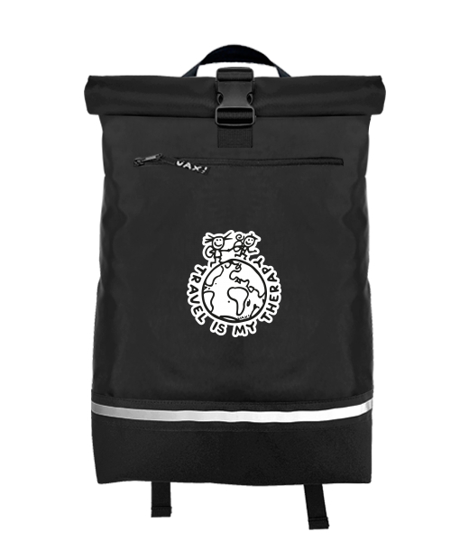 Originální batoh ROLL-TOP LARGE s potiskem 1240 TRAVEL IS MY THERAPY v barvě BLACK