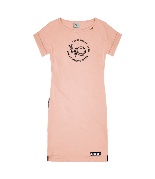 Dámské šaty BASIC s potiskem UAX pro ženy s potiskem 1296 LEPŠÍ VINNÝ STŘIK JAK NEVINÝ VÝSTŘIK v barvě PEACH
