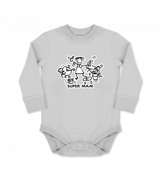 Dětské body dlouhý rukáv Lyžařská kolekce pro děti s potiskem 1126 SUPER MAM v barvě CEMENT