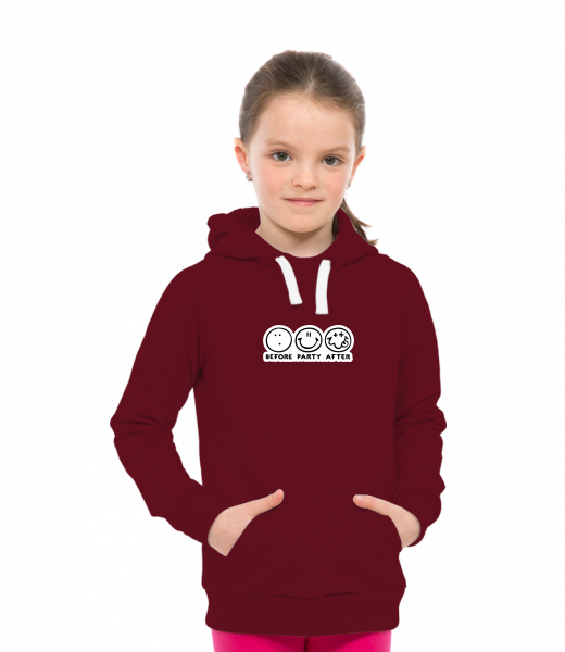 Dětská mikina LIGHT přes hlavu s kapucí a potiskem Lyžařská kolekce pro děti s potiskem 1120 BEFORE PARTY AFTER v barvě DARK RED