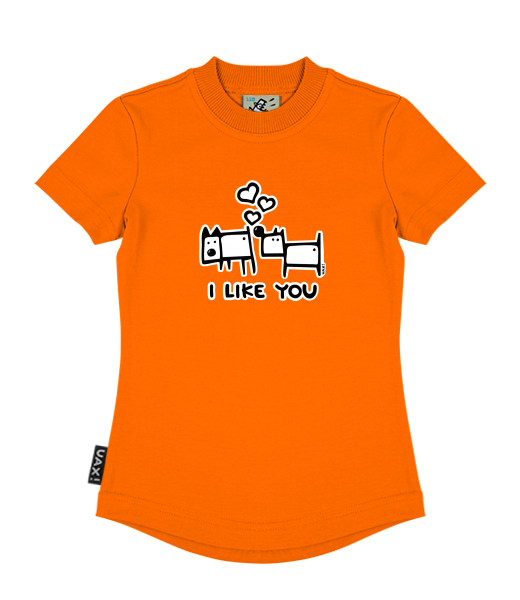 Vyrábíme udržitelné oblečení UAX! - ručně šité v Česku uaxDěti uaxLyžařská kolekceTričkaDÍVČÍ TRIČKOpotisk 1066 - I LIKE YOUSIGNAL ORANGE
