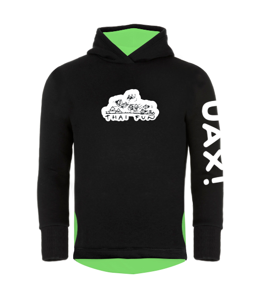 DĚTSKÁ ASYMETRICKÁ MIKINA s kapucí vylepšená o rostoucí rukávy, a extra hlbokou kapuci, která vypadá cool. Hladká zateplená mikina přes hlavu, s hlubokými kapsami na IPhone po boku má pohodlný střih a prodloužený spodní zadní lem. Pohodlná, praktická a více účelová unisex dětská mikina. Mix & Match - Vybírej z mnoha originálních potisků a kombinuj pestré barvy. Konfigurátor barev! Vyber si barvu jakou budou mít vnitřní kapsy, vnitřek kapuce a zadní vnitřní lem. Mikina je potisknutá nápisem UAX! na levém rukávu.