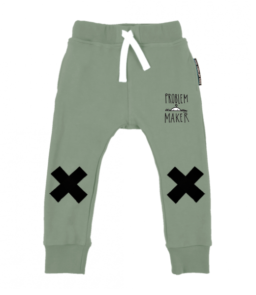 Dětské tepláky slim CROSS pro děti s potiskem 1385 PROBLEM MAKER v barvě OLIVA
