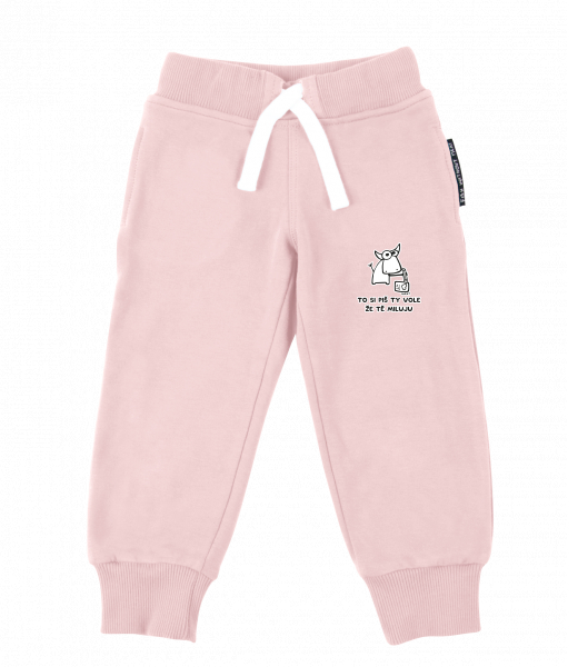 Dětské tepláky s originálním potiskem pro děti s potiskem 1192 TO SI PIŠ TY VOLE ŽE TĚ MILUJU v barvě OLD PINK