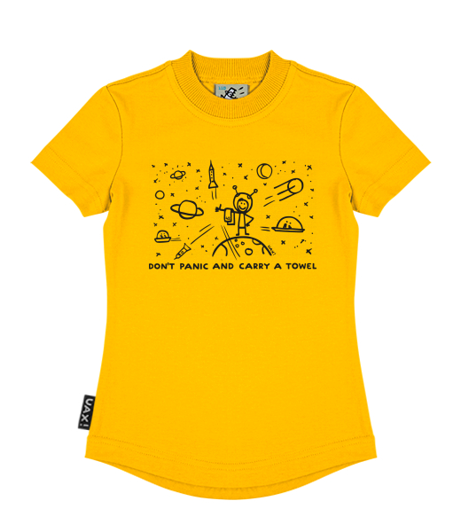 Vyrábíme udržitelné oblečení UAX! - ručně šité v Česku uaxDěti uaxVšechny produktyTričkaDÍVČÍ TRIČKOpotisk 1156 - DON'T PANIC GALAXYGOLDEN CREAM