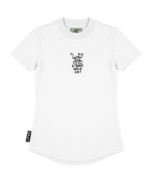 Vyrábíme udržitelné oblečení UAX! - ručně šité v Česku uaxDěti uaxVšechny produktyTričkaDÍVČÍ TRIČKOpotisk 1291 - E-BIKE NO A CO?WHITE