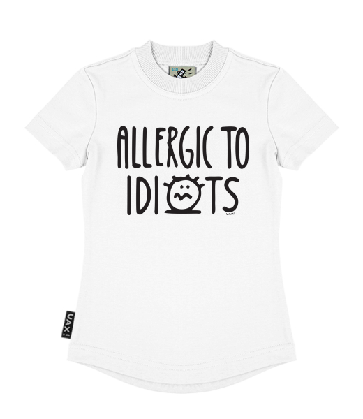Vyrábíme udržitelné oblečení UAX! - ručně šité v Česku uaxDěti uaxVšechny produktyTričkaDÍVČÍ TRIČKOpotisk 1354 - ALLERGIC TO IDIOTSWHITE