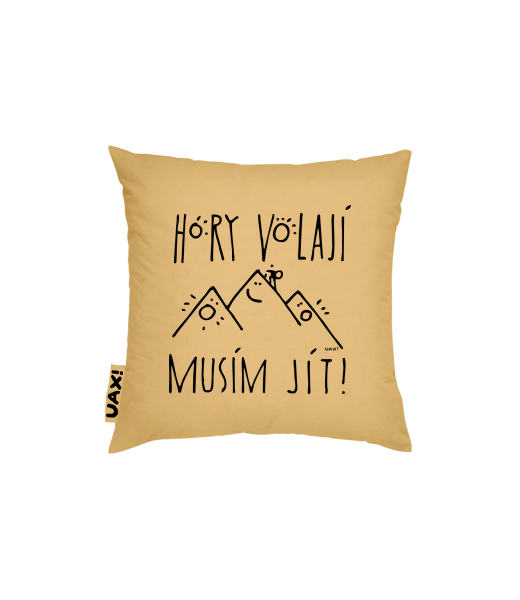 Vyrábíme udržitelné oblečení UAX! - ručně šité v Česku uaxDoplňky uaxDomácí design a doplňkyPolštářePOVLAK NA POLŠTÁŘ 40x40potisk 1233 - HORY VOLAJÍ MUSÍM JÍTMUSTARD