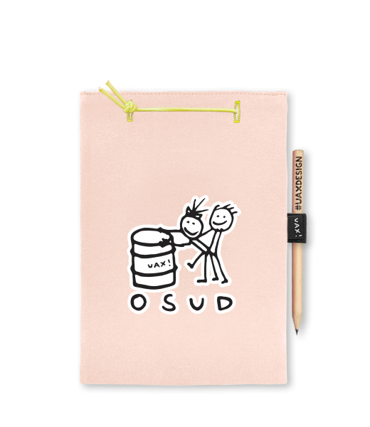 Blok A4 s vyměnitelnými papíry. Na přední straně možnost výběru z více než 300 potisků. Vyrobeno ze 100% bavlny. Výběr z 28 barev. Tiskneme ručním sítotiskem. V horní části blok A4 stažen žlutou gumičkou. 60 listů s perforací pro snadnější odtržení. Žlutá guma ve spodní části pro zajištění obalu. K bloku získáte i tužku #UAXDESIGN