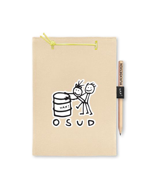 Blok A4 s vyměnitelnými papíry. Na přední straně možnost výběru z více než 300 potisků. Vyrobeno ze 100% bavlny. Výběr z 28 barev. Tiskneme ručním sítotiskem. V horní části blok A4 stažen žlutou gumičkou. 60 listů s perforací pro snadnější odtržení. Žlutá guma ve spodní části pro zajištění obalu. K bloku získáte i tužku #UAXDESIGN