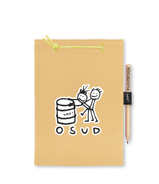 Blok A4 s vyměnitelnými papíry. Na přední straně možnost výběru z více než 300 potisků. Vyrobeno ze 100% bavlny. Výběr z 28 barev. Tiskneme ručním sítotiskem. V horní části blok A4 stažen žlutou gumičkou. 60 listů s perforací pro snadnější odtržení. Žlutá guma ve spodní části pro zajištění obalu. K bloku získáte i tužku #UAXDESIGN