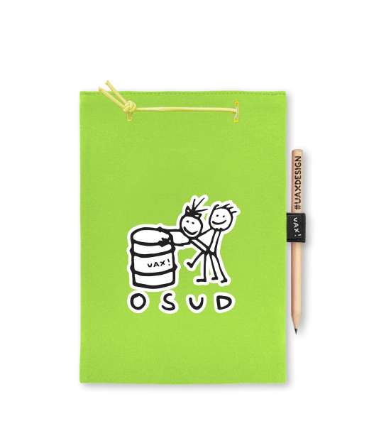 Blok A4 s vyměnitelnými papíry. Na přední straně možnost výběru z více než 300 potisků. Vyrobeno ze 100% bavlny. Výběr z 28 barev. Tiskneme ručním sítotiskem. V horní části blok A4 stažen žlutou gumičkou. 60 listů s perforací pro snadnější odtržení. Žlutá guma ve spodní části pro zajištění obalu. K bloku získáte i tužku #UAXDESIGN