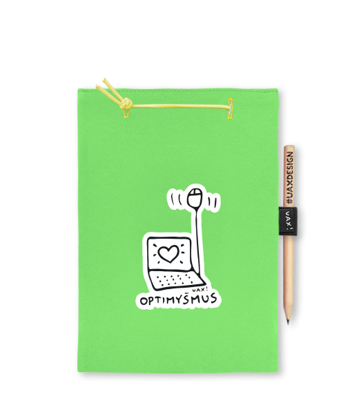 Blok A4 s vyměnitelnými papíry. Na přední straně možnost výběru z více než 300 potisků. Vyrobeno ze 100% bavlny. Výběr z 28 barev. Tiskneme ručním sítotiskem. V horní části blok A4 stažen žlutou gumičkou. 60 listů s perforací pro snadnější odtržení. Žlutá guma ve spodní části pro zajištění obalu. K bloku získáte i tužku #UAXDESIGN