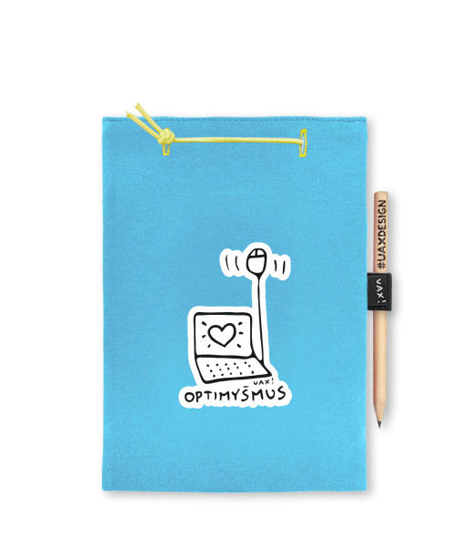 Blok A4 s vyměnitelnými papíry. Na přední straně možnost výběru z více než 300 potisků. Vyrobeno ze 100% bavlny. Výběr z 28 barev. Tiskneme ručním sítotiskem. V horní části blok A4 stažen žlutou gumičkou. 60 listů s perforací pro snadnější odtržení. Žlutá guma ve spodní části pro zajištění obalu. K bloku získáte i tužku #UAXDESIGN
