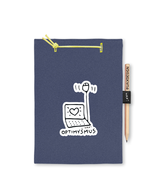 Blok A4 s vyměnitelnými papíry. Na přední straně možnost výběru z více než 300 potisků. Vyrobeno ze 100% bavlny. Výběr z 28 barev. Tiskneme ručním sítotiskem. V horní části blok A4 stažen žlutou gumičkou. 60 listů s perforací pro snadnější odtržení. Žlutá guma ve spodní části pro zajištění obalu. K bloku získáte i tužku #UAXDESIGN