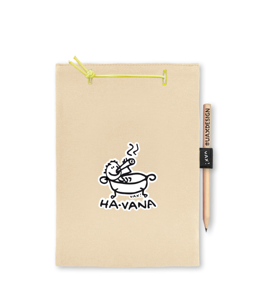Blok A4 s vyměnitelnými papíry. Na přední straně možnost výběru z více než 300 potisků. Vyrobeno ze 100% bavlny. Výběr z 28 barev. Tiskneme ručním sítotiskem. V horní části blok A4 stažen žlutou gumičkou. 60 listů s perforací pro snadnější odtržení. Žlutá guma ve spodní části pro zajištění obalu. K bloku získáte i tužku #UAXDESIGN