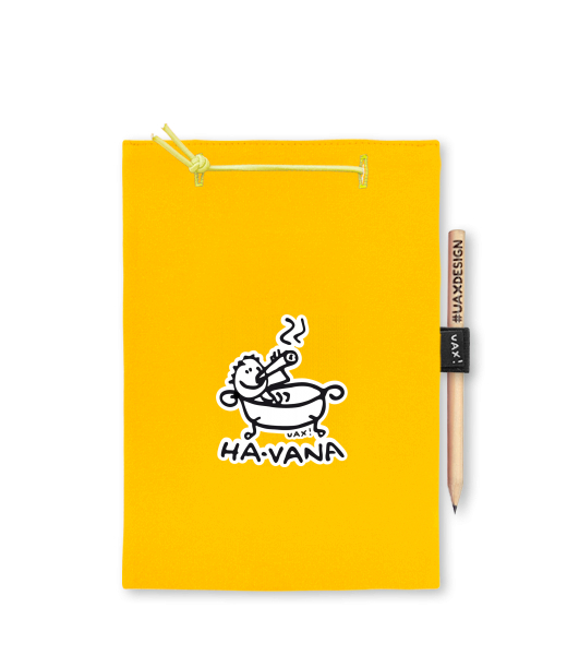 Blok A4 s vyměnitelnými papíry. Na přední straně možnost výběru z více než 300 potisků. Vyrobeno ze 100% bavlny. Výběr z 28 barev. Tiskneme ručním sítotiskem. V horní části blok A4 stažen žlutou gumičkou. 60 listů s perforací pro snadnější odtržení. Žlutá guma ve spodní části pro zajištění obalu. K bloku získáte i tužku #UAXDESIGN