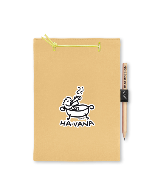 Blok A4 s vyměnitelnými papíry. Na přední straně možnost výběru z více než 300 potisků. Vyrobeno ze 100% bavlny. Výběr z 28 barev. Tiskneme ručním sítotiskem. V horní části blok A4 stažen žlutou gumičkou. 60 listů s perforací pro snadnější odtržení. Žlutá guma ve spodní části pro zajištění obalu. K bloku získáte i tužku #UAXDESIGN