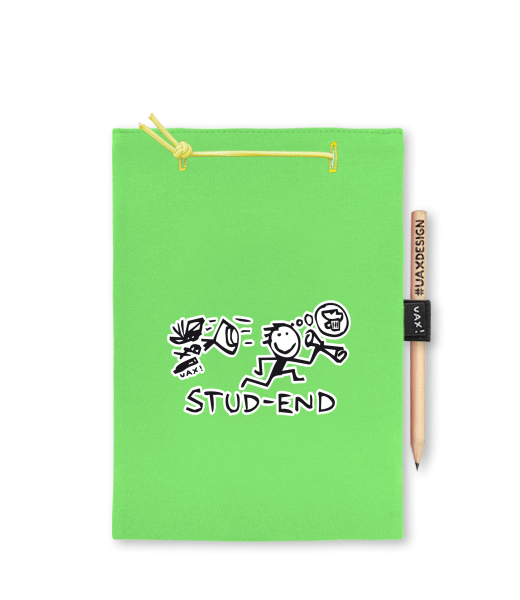 Blok A4 s vyměnitelnými papíry. Na přední straně možnost výběru z více než 300 potisků. Vyrobeno ze 100% bavlny. Výběr z 28 barev. Tiskneme ručním sítotiskem. V horní části blok A4 stažen žlutou gumičkou. 60 listů s perforací pro snadnější odtržení. Žlutá guma ve spodní části pro zajištění obalu. K bloku získáte i tužku #UAXDESIGN