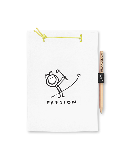 Blok A4 s vyměnitelnými papíry. Na přední straně možnost výběru z více než 300 potisků. Vyrobeno ze 100% bavlny. Výběr z 28 barev. Tiskneme ručním sítotiskem. V horní části blok A4 stažen žlutou gumičkou. 60 listů s perforací pro snadnější odtržení. Žlutá guma ve spodní části pro zajištění obalu. K bloku získáte i tužku #UAXDESIGN