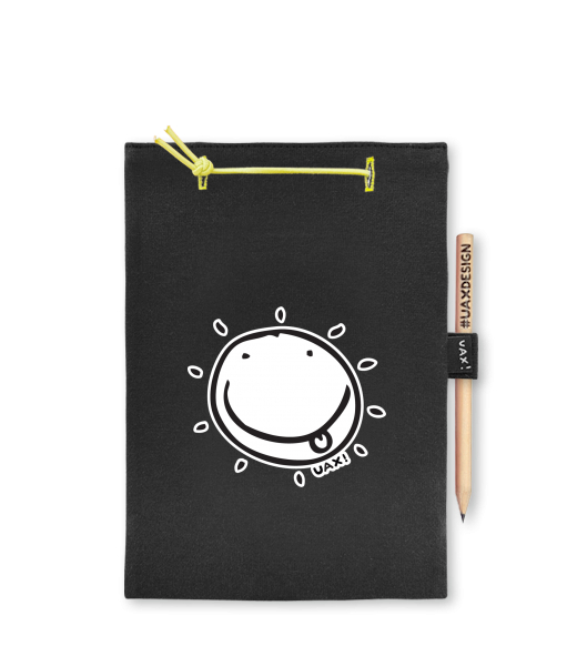 Blok A4 s vyměnitelnými papíry. Na přední straně možnost výběru z více než 300 potisků. Vyrobeno ze 100% bavlny. Výběr z 28 barev. Tiskneme ručním sítotiskem. V horní části blok A4 stažen žlutou gumičkou. 60 listů s perforací pro snadnější odtržení. Žlutá guma ve spodní části pro zajištění obalu. K bloku získáte i tužku #UAXDESIGN