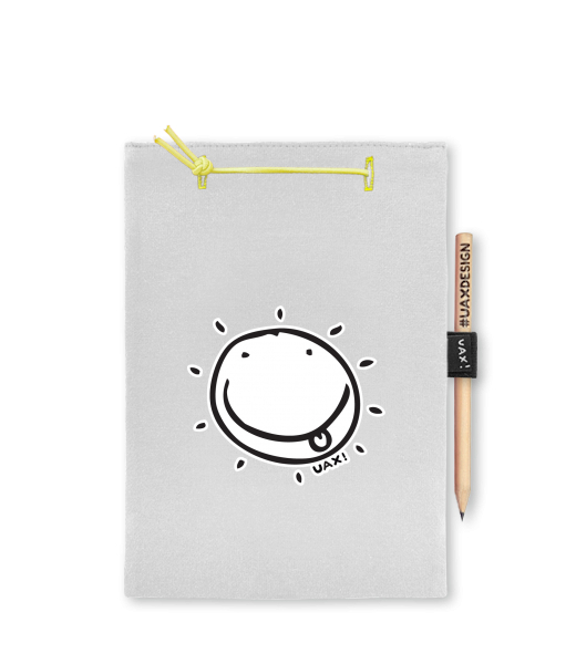 Blok A4 s vyměnitelnými papíry. Na přední straně možnost výběru z více než 300 potisků. Vyrobeno ze 100% bavlny. Výběr z 28 barev. Tiskneme ručním sítotiskem. V horní části blok A4 stažen žlutou gumičkou. 60 listů s perforací pro snadnější odtržení. Žlutá guma ve spodní části pro zajištění obalu. K bloku získáte i tužku #UAXDESIGN