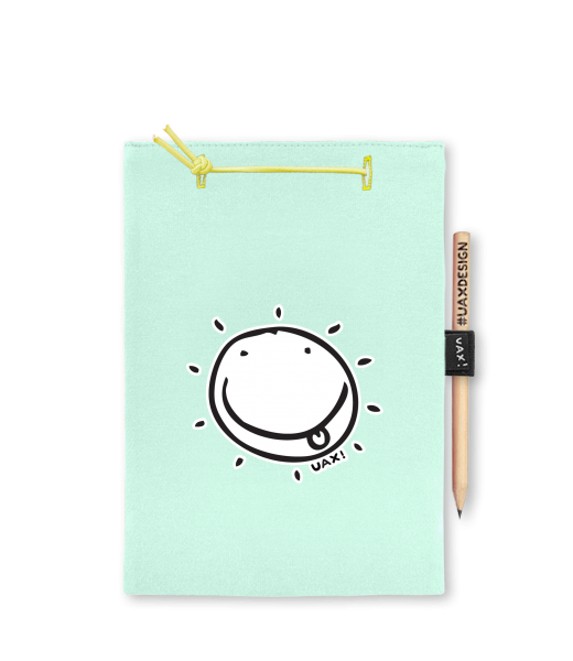 Blok A4 s vyměnitelnými papíry. Na přední straně možnost výběru z více než 300 potisků. Vyrobeno ze 100% bavlny. Výběr z 28 barev. Tiskneme ručním sítotiskem. V horní části blok A4 stažen žlutou gumičkou. 60 listů s perforací pro snadnější odtržení. Žlutá guma ve spodní části pro zajištění obalu. K bloku získáte i tužku #UAXDESIGN