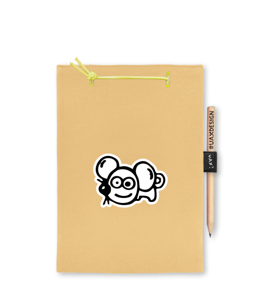 Blok A4 s vyměnitelnými papíry. Na přední straně možnost výběru z více než 300 potisků. Vyrobeno ze 100% bavlny. Výběr z 28 barev. Tiskneme ručním sítotiskem. V horní části blok A4 stažen žlutou gumičkou. 60 listů s perforací pro snadnější odtržení. Žlutá guma ve spodní části pro zajištění obalu. K bloku získáte i tužku #UAXDESIGN