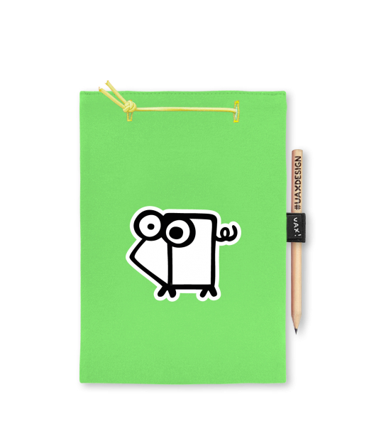 Blok A4 s vyměnitelnými papíry. Na přední straně možnost výběru z více než 300 potisků. Vyrobeno ze 100% bavlny. Výběr z 28 barev. Tiskneme ručním sítotiskem. V horní části blok A4 stažen žlutou gumičkou. 60 listů s perforací pro snadnější odtržení. Žlutá guma ve spodní části pro zajištění obalu. K bloku získáte i tužku #UAXDESIGN