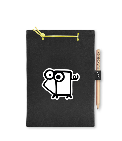 Blok A4 s vyměnitelnými papíry. Na přední straně možnost výběru z více než 300 potisků. Vyrobeno ze 100% bavlny. Výběr z 28 barev. Tiskneme ručním sítotiskem. V horní části blok A4 stažen žlutou gumičkou. 60 listů s perforací pro snadnější odtržení. Žlutá guma ve spodní části pro zajištění obalu. K bloku získáte i tužku #UAXDESIGN