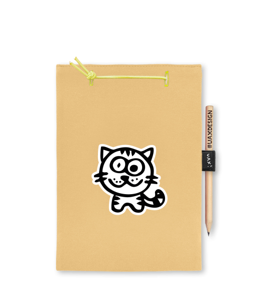 Blok A4 s vyměnitelnými papíry. Na přední straně možnost výběru z více než 300 potisků. Vyrobeno ze 100% bavlny. Výběr z 28 barev. Tiskneme ručním sítotiskem. V horní části blok A4 stažen žlutou gumičkou. 60 listů s perforací pro snadnější odtržení. Žlutá guma ve spodní části pro zajištění obalu. K bloku získáte i tužku #UAXDESIGN