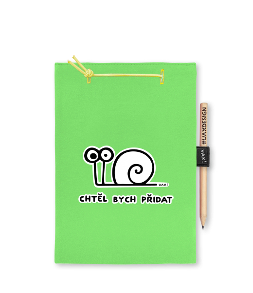 Blok A4 s vyměnitelnými papíry. Na přední straně možnost výběru z více než 300 potisků. Vyrobeno ze 100% bavlny. Výběr z 28 barev. Tiskneme ručním sítotiskem. V horní části blok A4 stažen žlutou gumičkou. 60 listů s perforací pro snadnější odtržení. Žlutá guma ve spodní části pro zajištění obalu. K bloku získáte i tužku #UAXDESIGN