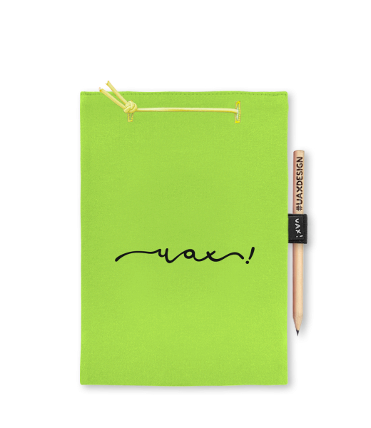 Blok A4 s vyměnitelnými papíry. Na přední straně možnost výběru z více než 300 potisků. Vyrobeno ze 100% bavlny. Výběr z 28 barev. Tiskneme ručním sítotiskem. V horní části blok A4 stažen žlutou gumičkou. 60 listů s perforací pro snadnější odtržení. Žlutá guma ve spodní části pro zajištění obalu. K bloku získáte i tužku #UAXDESIGN