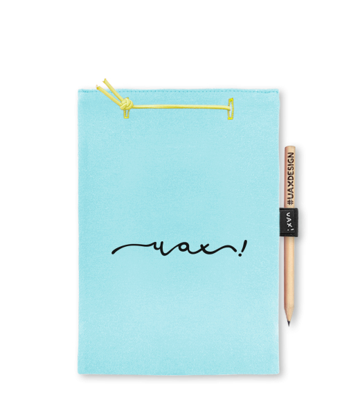 Blok A4 s vyměnitelnými papíry. Na přední straně možnost výběru z více než 300 potisků. Vyrobeno ze 100% bavlny. Výběr z 28 barev. Tiskneme ručním sítotiskem. V horní části blok A4 stažen žlutou gumičkou. 60 listů s perforací pro snadnější odtržení. Žlutá guma ve spodní části pro zajištění obalu. K bloku získáte i tužku #UAXDESIGN