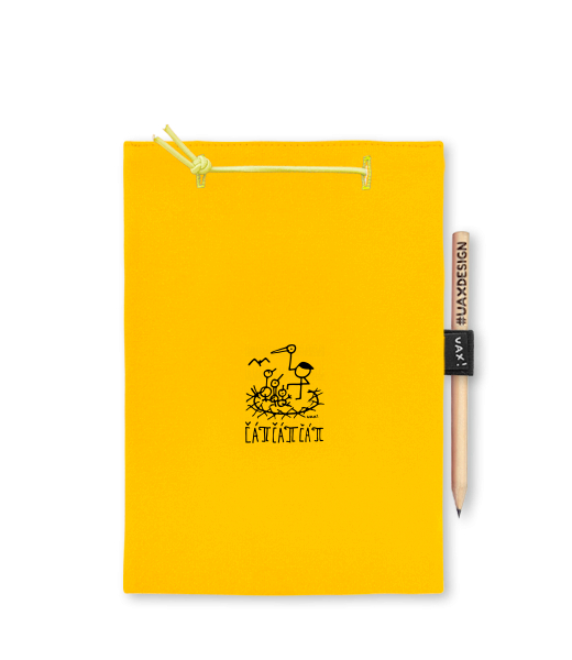 Blok A4 s vyměnitelnými papíry. Na přední straně možnost výběru z více než 300 potisků. Vyrobeno ze 100% bavlny. Výběr z 28 barev. Tiskneme ručním sítotiskem. V horní části blok A4 stažen žlutou gumičkou. 60 listů s perforací pro snadnější odtržení. Žlutá guma ve spodní části pro zajištění obalu. K bloku získáte i tužku #UAXDESIGN