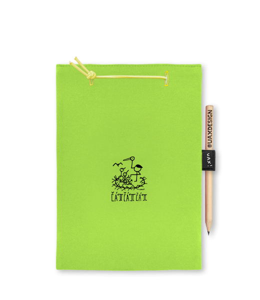 Blok A4 s vyměnitelnými papíry. Na přední straně možnost výběru z více než 300 potisků. Vyrobeno ze 100% bavlny. Výběr z 28 barev. Tiskneme ručním sítotiskem. V horní části blok A4 stažen žlutou gumičkou. 60 listů s perforací pro snadnější odtržení. Žlutá guma ve spodní části pro zajištění obalu. K bloku získáte i tužku #UAXDESIGN