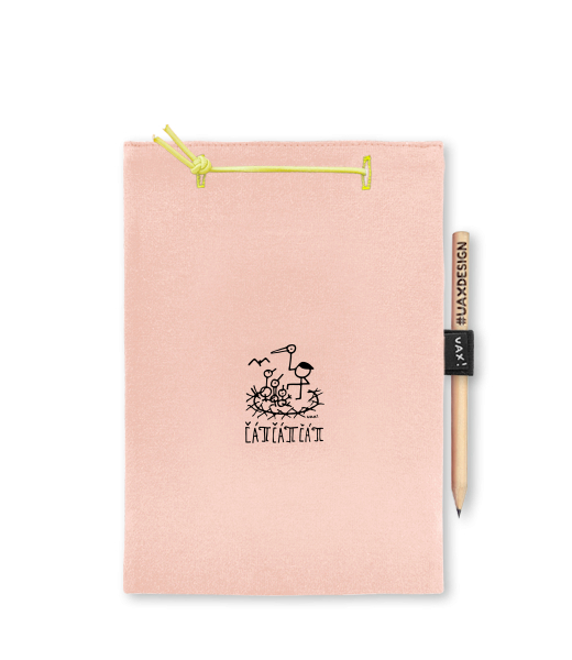 Blok A4 s vyměnitelnými papíry. Na přední straně možnost výběru z více než 300 potisků. Vyrobeno ze 100% bavlny. Výběr z 28 barev. Tiskneme ručním sítotiskem. V horní části blok A4 stažen žlutou gumičkou. 60 listů s perforací pro snadnější odtržení. Žlutá guma ve spodní části pro zajištění obalu. K bloku získáte i tužku #UAXDESIGN