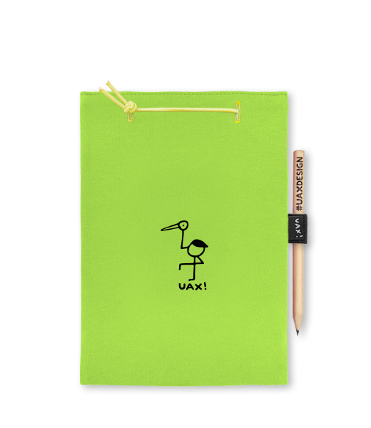 Blok A4 s vyměnitelnými papíry. Na přední straně možnost výběru z více než 300 potisků. Vyrobeno ze 100% bavlny. Výběr z 28 barev. Tiskneme ručním sítotiskem. V horní části blok A4 stažen žlutou gumičkou. 60 listů s perforací pro snadnější odtržení. Žlutá guma ve spodní části pro zajištění obalu. K bloku získáte i tužku #UAXDESIGN