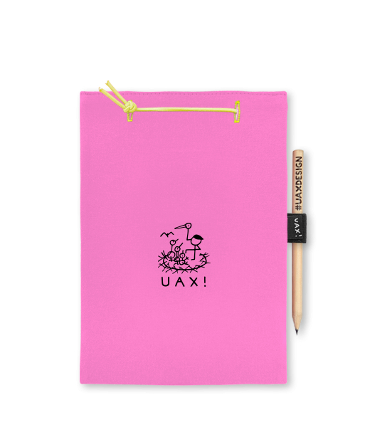 Blok A4 s vyměnitelnými papíry. Na přední straně možnost výběru z více než 300 potisků. Vyrobeno ze 100% bavlny. Výběr z 28 barev. Tiskneme ručním sítotiskem. V horní části blok A4 stažen žlutou gumičkou. 60 listů s perforací pro snadnější odtržení. Žlutá guma ve spodní části pro zajištění obalu. K bloku získáte i tužku #UAXDESIGN