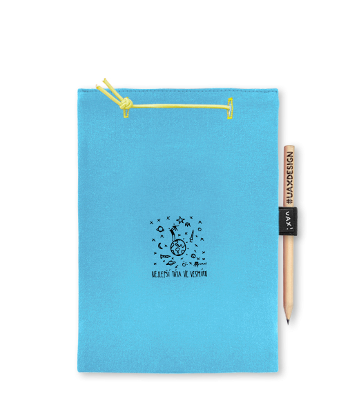 Blok A4 s vyměnitelnými papíry. Na přední straně možnost výběru z více než 300 potisků. Vyrobeno ze 100% bavlny. Výběr z 28 barev. Tiskneme ručním sítotiskem. V horní části blok A4 stažen žlutou gumičkou. 60 listů s perforací pro snadnější odtržení. Žlutá guma ve spodní části pro zajištění obalu. K bloku získáte i tužku #UAXDESIGN