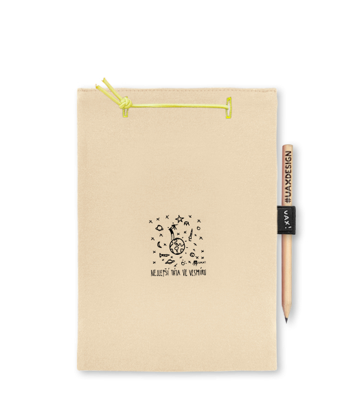 Blok A4 s vyměnitelnými papíry. Na přední straně možnost výběru z více než 300 potisků. Vyrobeno ze 100% bavlny. Výběr z 28 barev. Tiskneme ručním sítotiskem. V horní části blok A4 stažen žlutou gumičkou. 60 listů s perforací pro snadnější odtržení. Žlutá guma ve spodní části pro zajištění obalu. K bloku získáte i tužku #UAXDESIGN