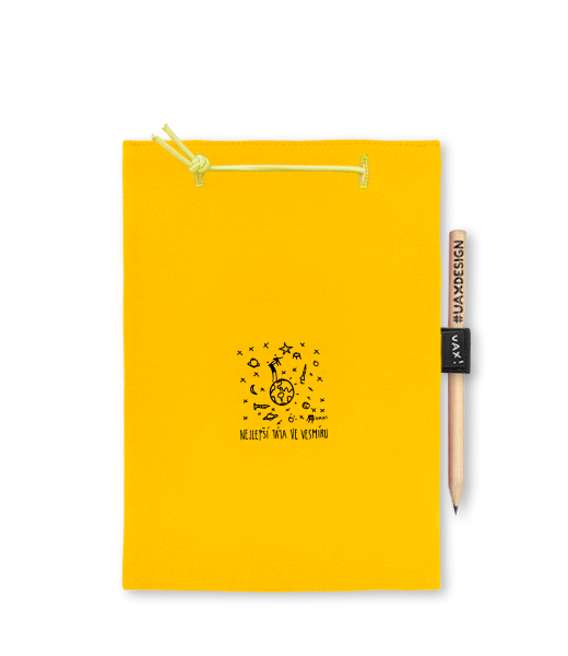 Blok A4 s vyměnitelnými papíry. Na přední straně možnost výběru z více než 300 potisků. Vyrobeno ze 100% bavlny. Výběr z 28 barev. Tiskneme ručním sítotiskem. V horní části blok A4 stažen žlutou gumičkou. 60 listů s perforací pro snadnější odtržení. Žlutá guma ve spodní části pro zajištění obalu. K bloku získáte i tužku #UAXDESIGN