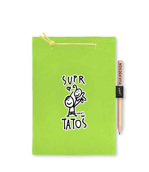 Blok A4 s vyměnitelnými papíry. Na přední straně možnost výběru z více než 300 potisků. Vyrobeno ze 100% bavlny. Výběr z 28 barev. Tiskneme ručním sítotiskem. V horní části blok A4 stažen žlutou gumičkou. 60 listů s perforací pro snadnější odtržení. Žlutá guma ve spodní části pro zajištění obalu. K bloku získáte i tužku #UAXDESIGN