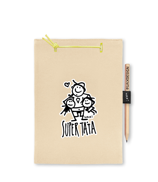 Blok A4 s vyměnitelnými papíry. Na přední straně možnost výběru z více než 300 potisků. Vyrobeno ze 100% bavlny. Výběr z 28 barev. Tiskneme ručním sítotiskem. V horní části blok A4 stažen žlutou gumičkou. 60 listů s perforací pro snadnější odtržení. Žlutá guma ve spodní části pro zajištění obalu. K bloku získáte i tužku #UAXDESIGN