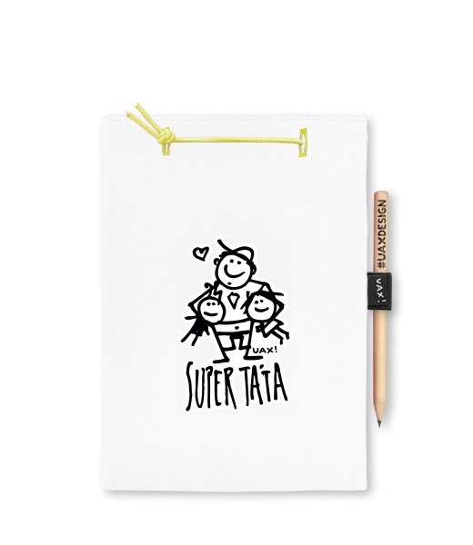 Blok A4 s vyměnitelnými papíry. Na přední straně možnost výběru z více než 300 potisků. Vyrobeno ze 100% bavlny. Výběr z 28 barev. Tiskneme ručním sítotiskem. V horní části blok A4 stažen žlutou gumičkou. 60 listů s perforací pro snadnější odtržení. Žlutá guma ve spodní části pro zajištění obalu. K bloku získáte i tužku #UAXDESIGN