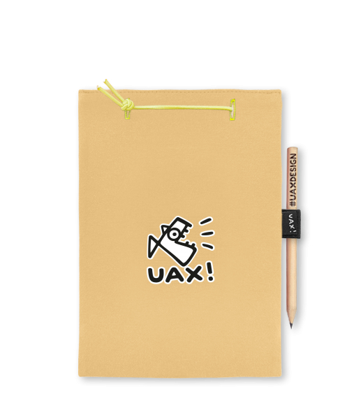 Blok A4 s vyměnitelnými papíry. Na přední straně možnost výběru z více než 300 potisků. Vyrobeno ze 100% bavlny. Výběr z 28 barev. Tiskneme ručním sítotiskem. V horní části blok A4 stažen žlutou gumičkou. 60 listů s perforací pro snadnější odtržení. Žlutá guma ve spodní části pro zajištění obalu. K bloku získáte i tužku #UAXDESIGN