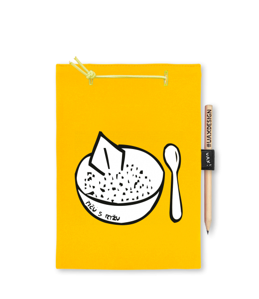 Blok A4 s vyměnitelnými papíry. Na přední straně možnost výběru z více než 300 potisků. Vyrobeno ze 100% bavlny. Výběr z 28 barev. Tiskneme ručním sítotiskem. V horní části blok A4 stažen žlutou gumičkou. 60 listů s perforací pro snadnější odtržení. Žlutá guma ve spodní části pro zajištění obalu. K bloku získáte i tužku #UAXDESIGN