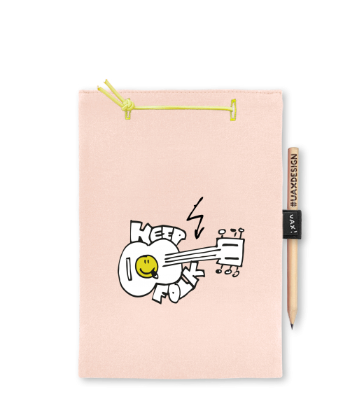 Blok A4 s vyměnitelnými papíry. Na přední straně možnost výběru z více než 300 potisků. Vyrobeno ze 100% bavlny. Výběr z 28 barev. Tiskneme ručním sítotiskem. V horní části blok A4 stažen žlutou gumičkou. 60 listů s perforací pro snadnější odtržení. Žlutá guma ve spodní části pro zajištění obalu. K bloku získáte i tužku #UAXDESIGN