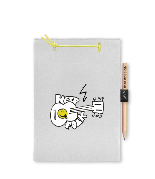 Blok A4 s vyměnitelnými papíry. Na přední straně možnost výběru z více než 300 potisků. Vyrobeno ze 100% bavlny. Výběr z 28 barev. Tiskneme ručním sítotiskem. V horní části blok A4 stažen žlutou gumičkou. 60 listů s perforací pro snadnější odtržení. Žlutá guma ve spodní části pro zajištění obalu. K bloku získáte i tužku #UAXDESIGN