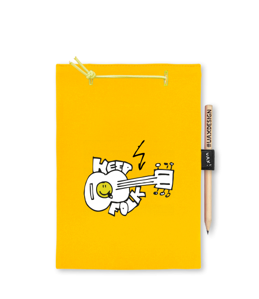 Blok A4 s vyměnitelnými papíry. Na přední straně možnost výběru z více než 300 potisků. Vyrobeno ze 100% bavlny. Výběr z 28 barev. Tiskneme ručním sítotiskem. V horní části blok A4 stažen žlutou gumičkou. 60 listů s perforací pro snadnější odtržení. Žlutá guma ve spodní části pro zajištění obalu. K bloku získáte i tužku #UAXDESIGN